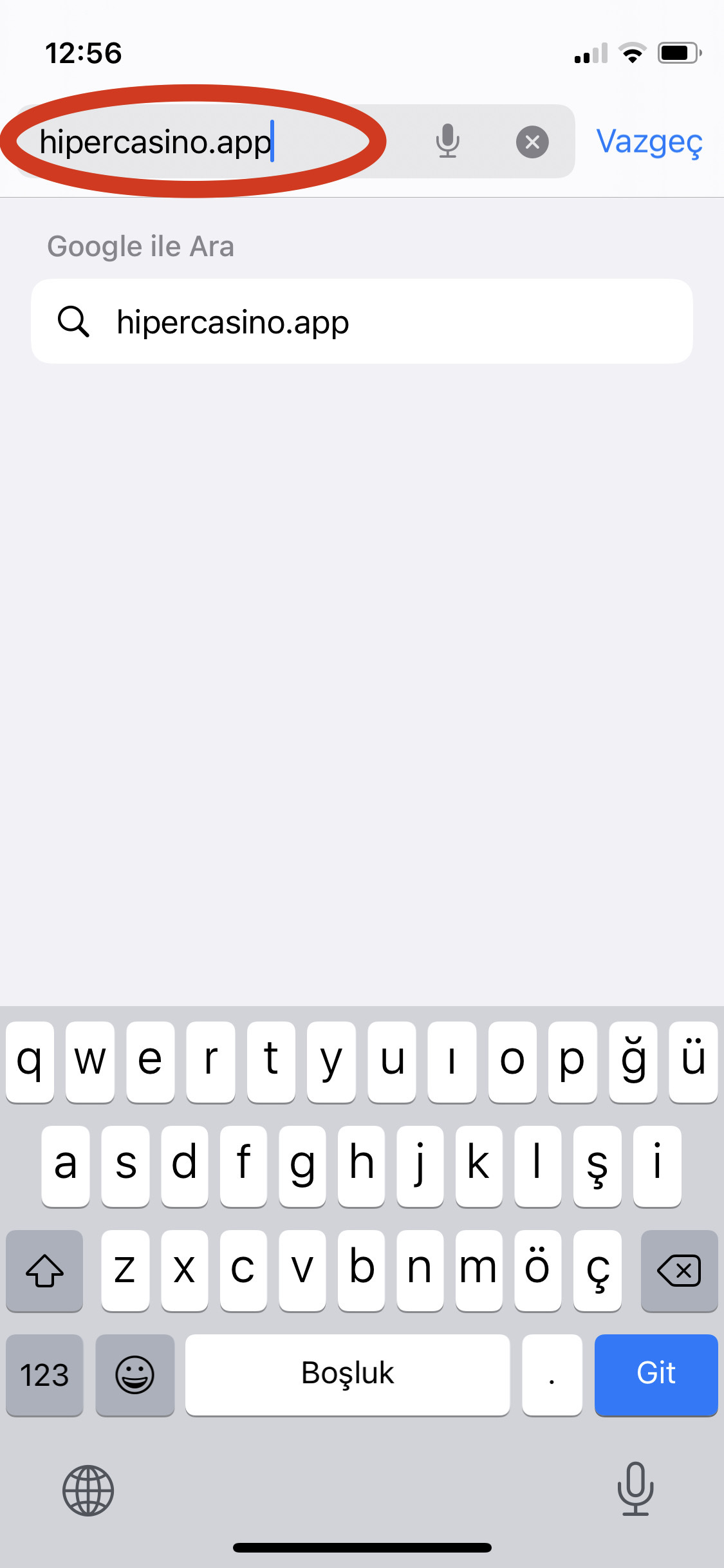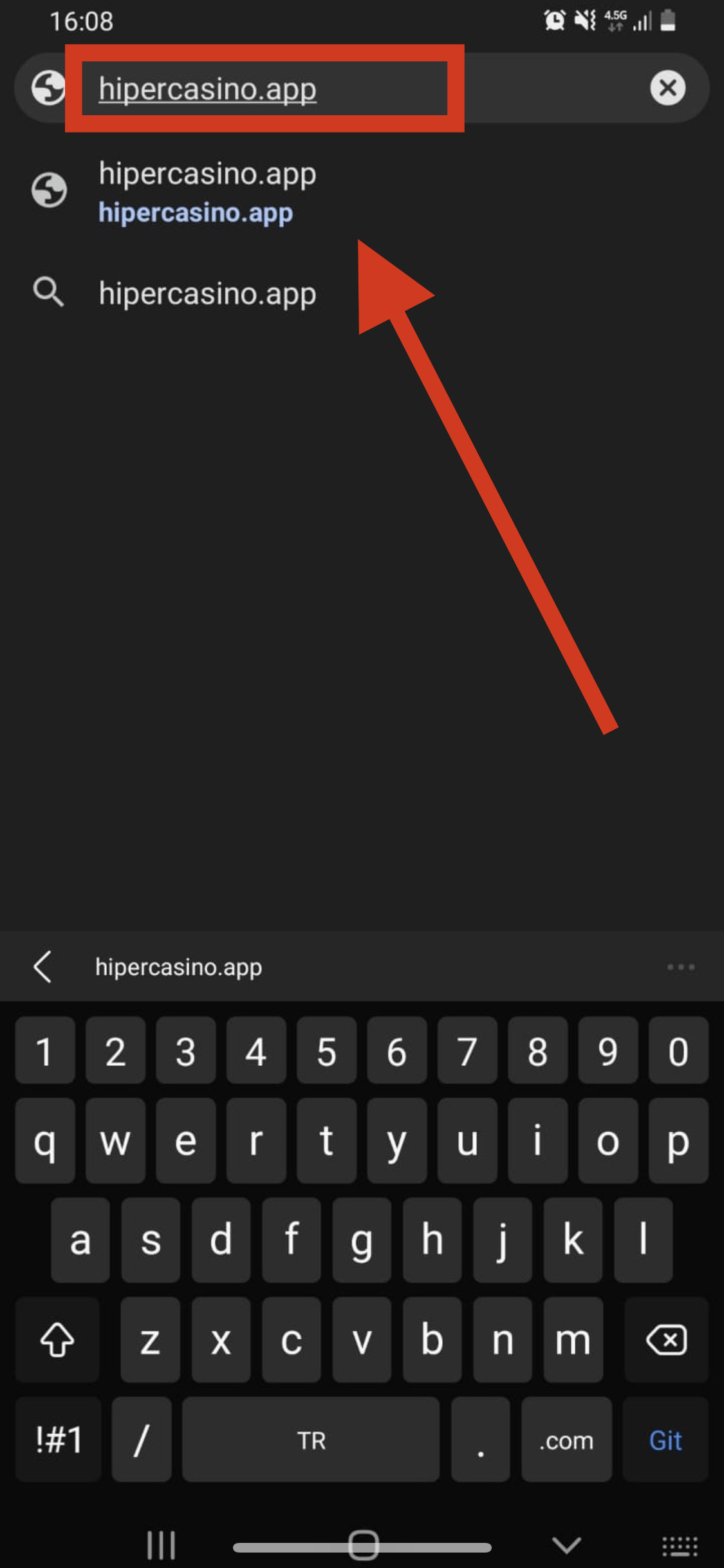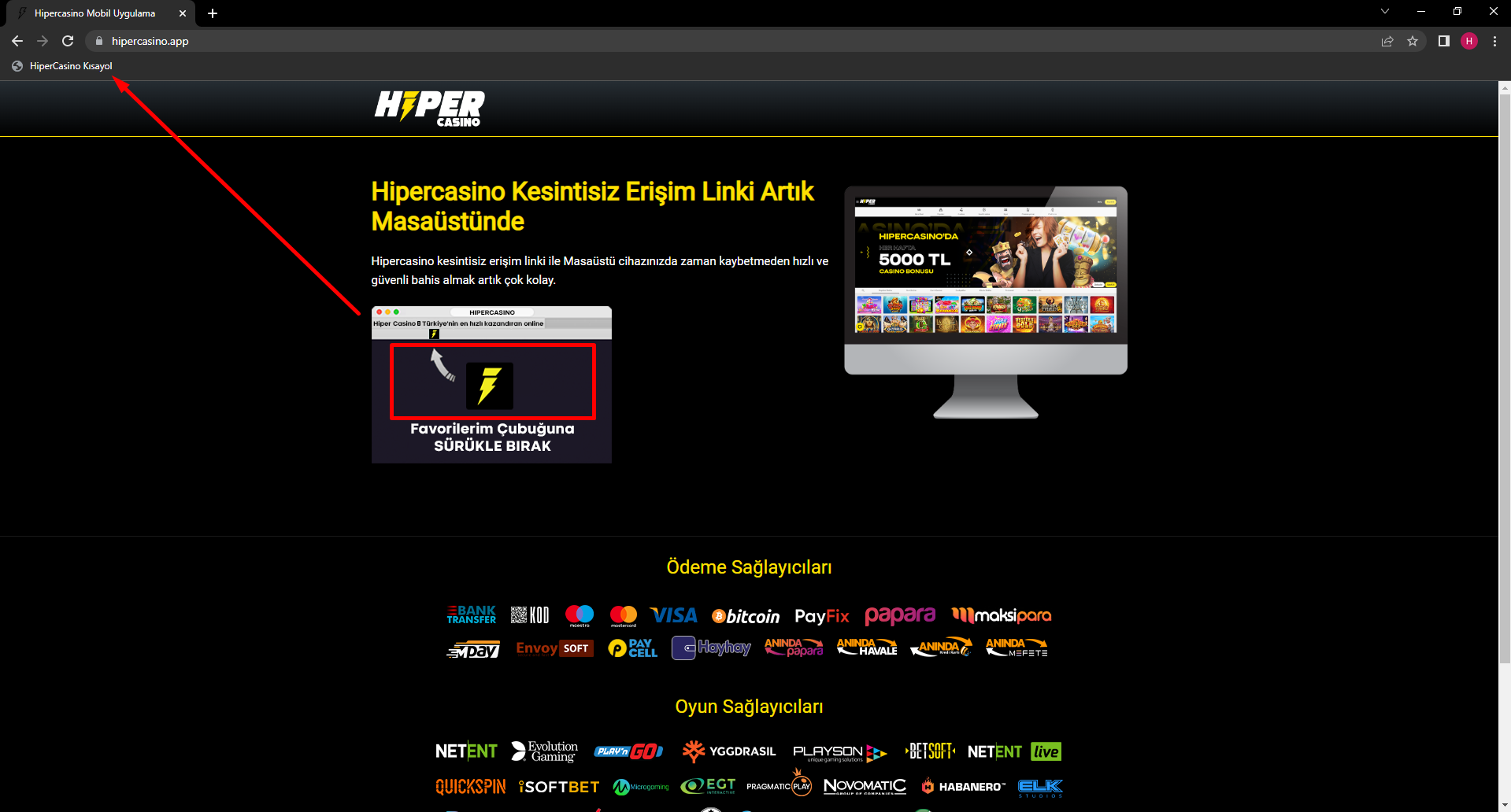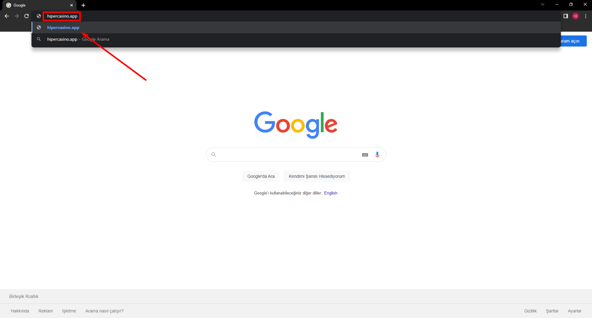 Masaüstü cihazınızdan herhangi bir internet tarayıcısını açıp, kırmızı ok ile gösterilen arama bölümüne hipercasinoapp1.com adresini yazınız.
