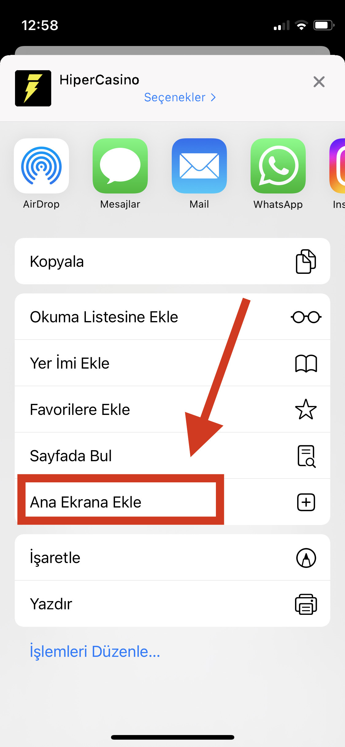 Ana Ekrana Ekle tuşuna basın.